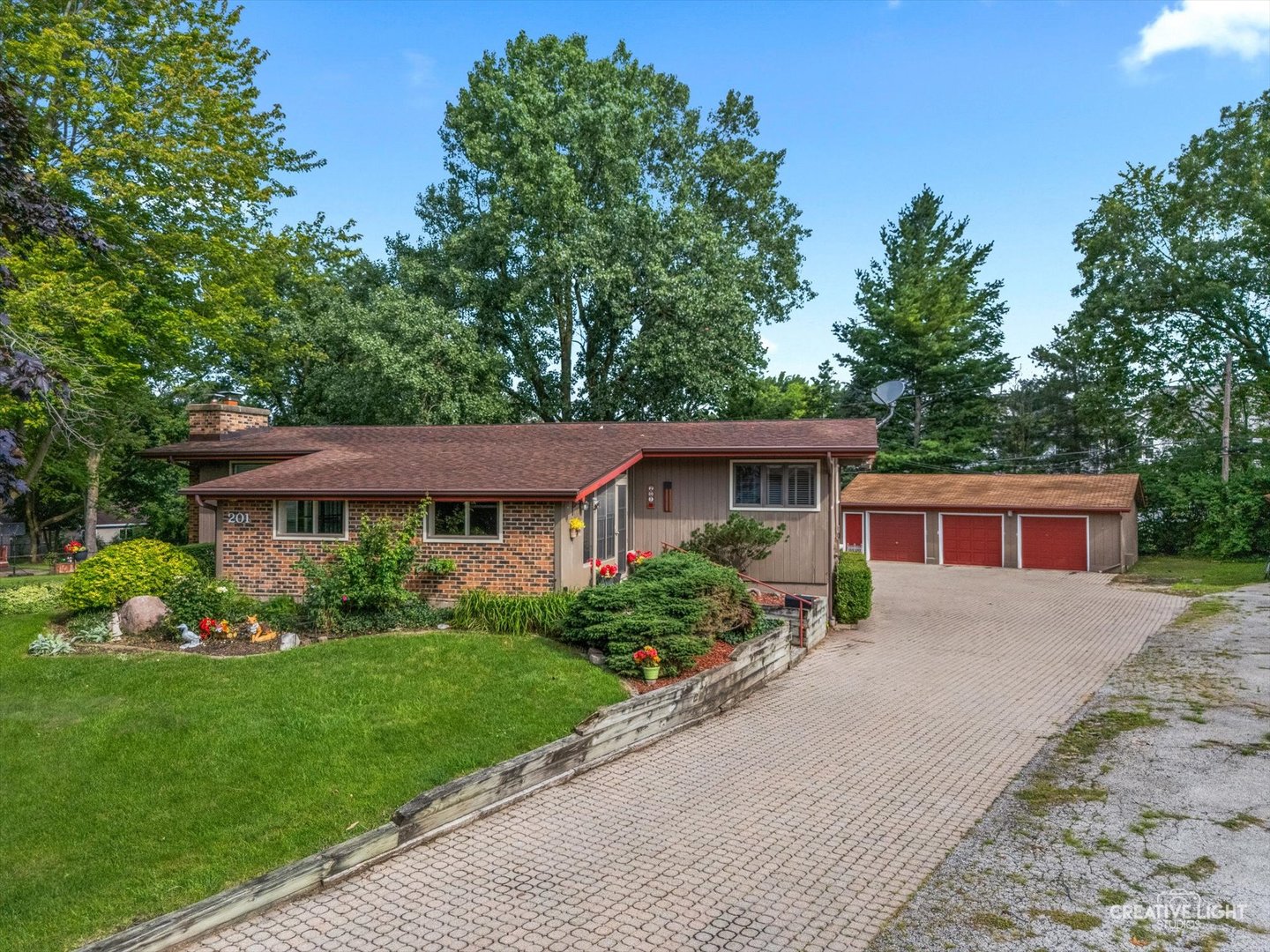 Spacious and versatile ranch home w/walk-out basement in the heart of North Aurora. This beautifully maintained 5-bedroom, 2.5-bath property offers unique features ideal for multi-generational living or extended guest stays. Step inside through the charming enclosed front porch and be greeted by a bright and airy living room with vaulted ceilings and a cozy wood-burning fireplace. The formal dining room has vaulted ceilings and skylight that flood the open space with natural light. The updated eat-in kitchen is designed for both function and style, featuring custom cabinetry, solid surface countertops, and a pantry closet. The main level also includes a spacious primary bedroom retreat complete with vaulted ceilings and a private half bath, and three closets for ample storage. An updated full bathroom and two additional bedrooms complete the main floor living area. You'll appreciate the thoughtful touches like the laundry chute. The full walkout basement expands your living options with a second kitchen, spacious family/rec room, two additional bedrooms, laundry/utility room, and a full bathroom-perfect--for an in-law arrangement or guest suite. Outdoor living is a breeze with a backyard deck, brick patio, and a storage shed, all ideal for entertaining or quiet relaxation. An extra-wide brick paver driveway leads to a detached 3-car garage, providing plenty of space for vehicles and hobbies. Professionally landscaped yard surrounds the home. This one-of-a-kind home combines space, style, and a smart layout to suit a variety of needs. Conveniently located to shopping, I-88 access, parks and the Fox River, as well as the tri-city area. Don't miss this opportunity to own a truly flexible and feature-rich home in a great North Aurora location!